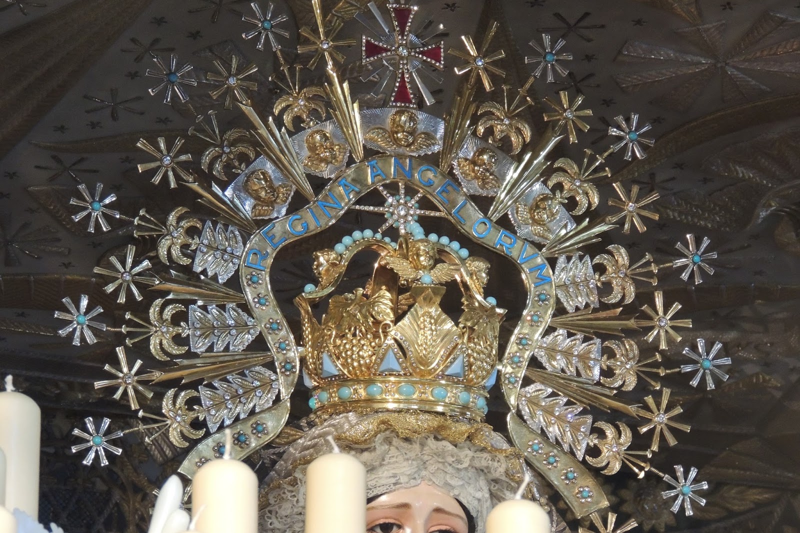 Detalle de la Cruz de Guía y abajo la Santísima Virgen representada como sacerdote en el Simpecado.